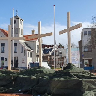 Op het Johan van Veenplein staan tot en met Pasen drie grote kruisen, duidelijk zichtbaar voor het verkeer op de N363 en het publiek op het plein.
