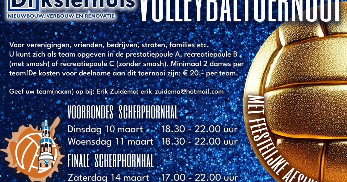 Dijksterhuis Volleybaltoernooi Overzicht Vorige Volgende dinsdag 10 maart 2026 , 18:30 - 22:00 Sporthal Scherphorn VOORRONDES