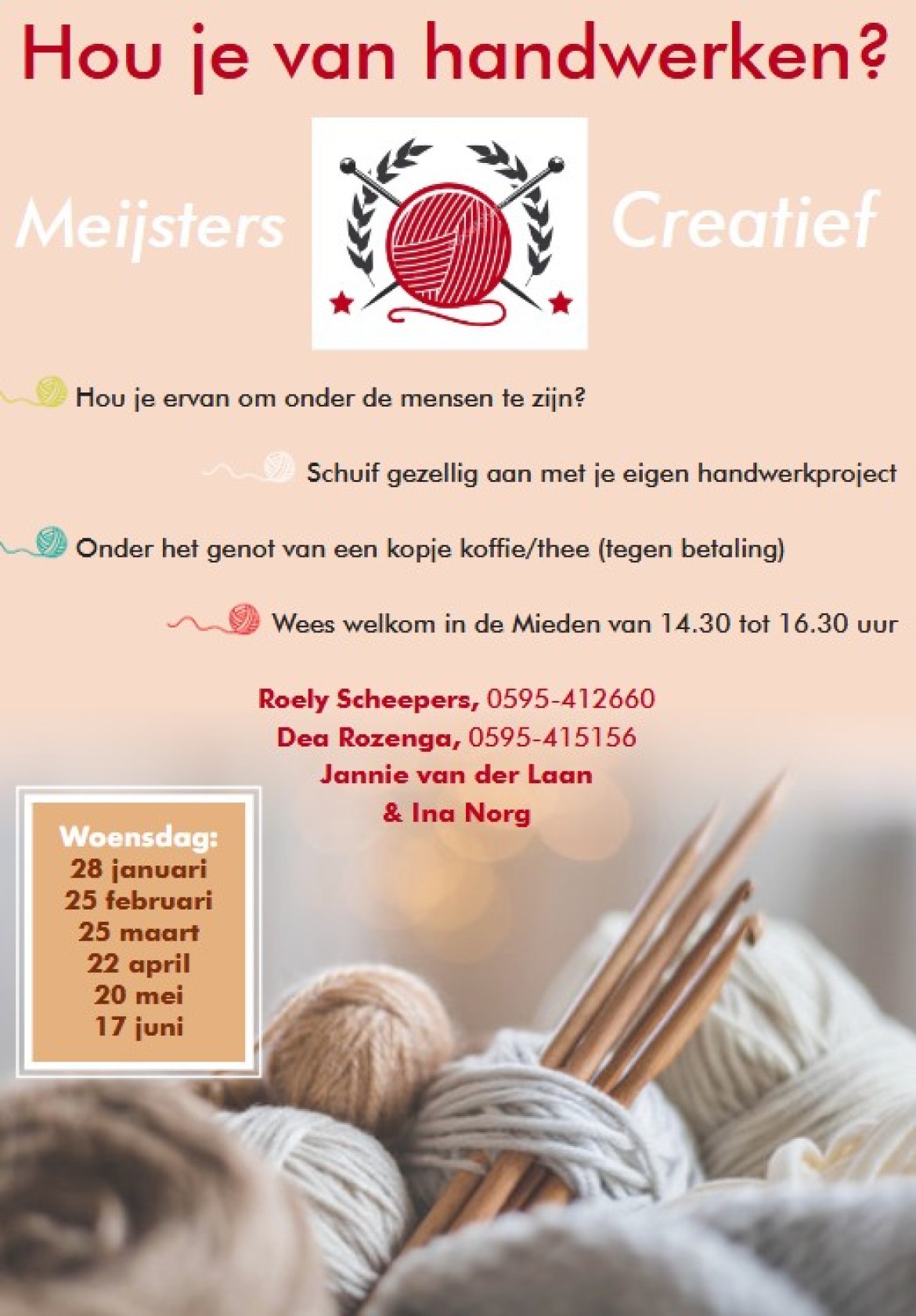 Voor de liefhebbers van handwerken en gezelligheid staan er 2026 al 5 bijeenkomsten gepland in De Mieden. Het is een mooie combinatie vanwege de ontspanning van het handwerken, een huislijke sfeer met een kopje koffie/thee en fijne garens.