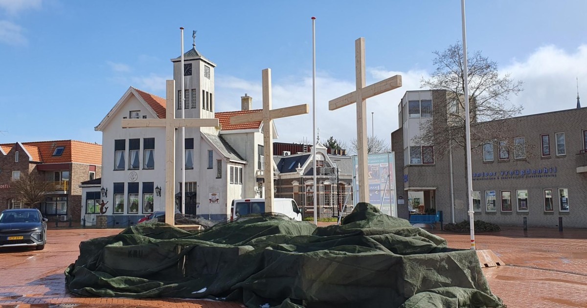 Op het Johan van Veenplein staan tot en met Pasen drie grote kruisen, duidelijk zichtbaar voor het verkeer op de N363 en het publiek op het plein.