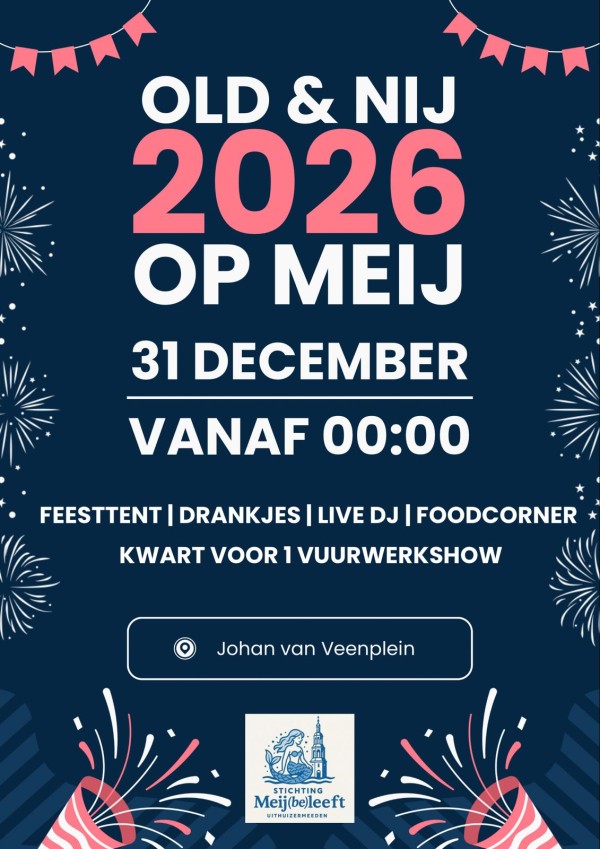 Op woensdag 31 december (Oudejaarsnacht) organiseert Stichting Meij(be)leeft in nauwe samenwerking met Stichting Dorpsbelangen Uithuizermeeden het evenement 'Old & Nij 2026 op Meij'. Vanaf klokslag middelnacht verandert het Johan van Veenplein in een bruisende ontmoetingsplek voor jong en oud om gezamenlijk het nieuwe jaar te verwelkomen. Hoogtepunten van de nacht: