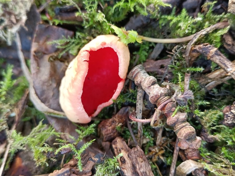 Tijdens de excursie was er ook aandacht voor andere natuur in de kooi, zoals de verschillende bomen die er groeien, de breedbladige wespenorchis die er zomerdag bloeit en de verschillende paddenstoelen; o.a. judasoor, gele trilzwam en rode kelkzwam. De laatste is een echte winterpaddenstoel.