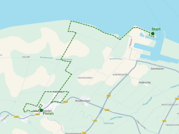 Deelnemers kunnen met de trein vanaf Uithuizermeeden naar de Eemshaven reizen om aldaar te starten. (De treinen vertrekken om 09.00, 09:30, 10:00 en 10:30 uur vanuit Uithuizermeeden naar het startpunt.) Start is om 11.00 uur nabij AG Ems. De route gaat via de dijk door de polder naar Uithuizermeeden.